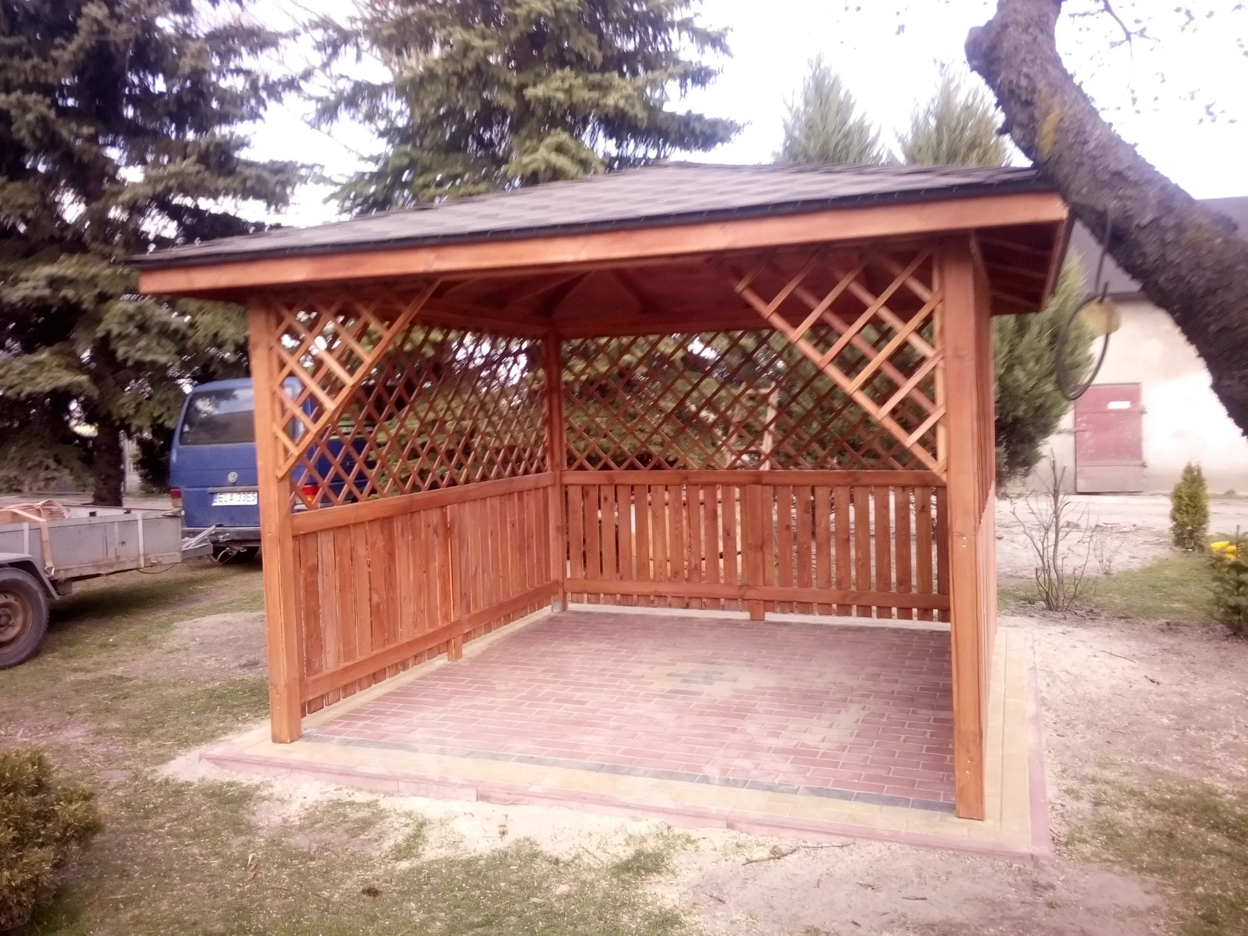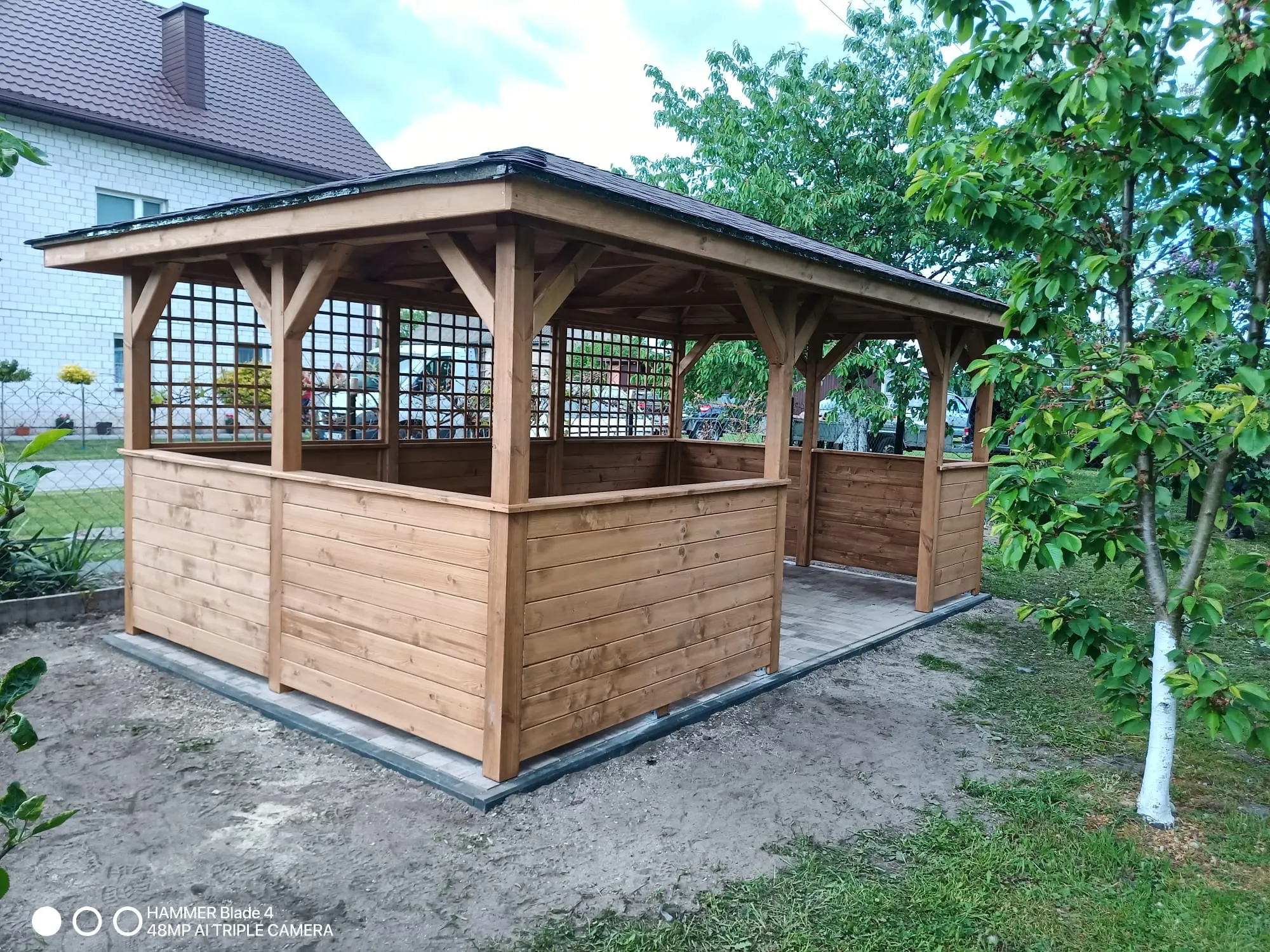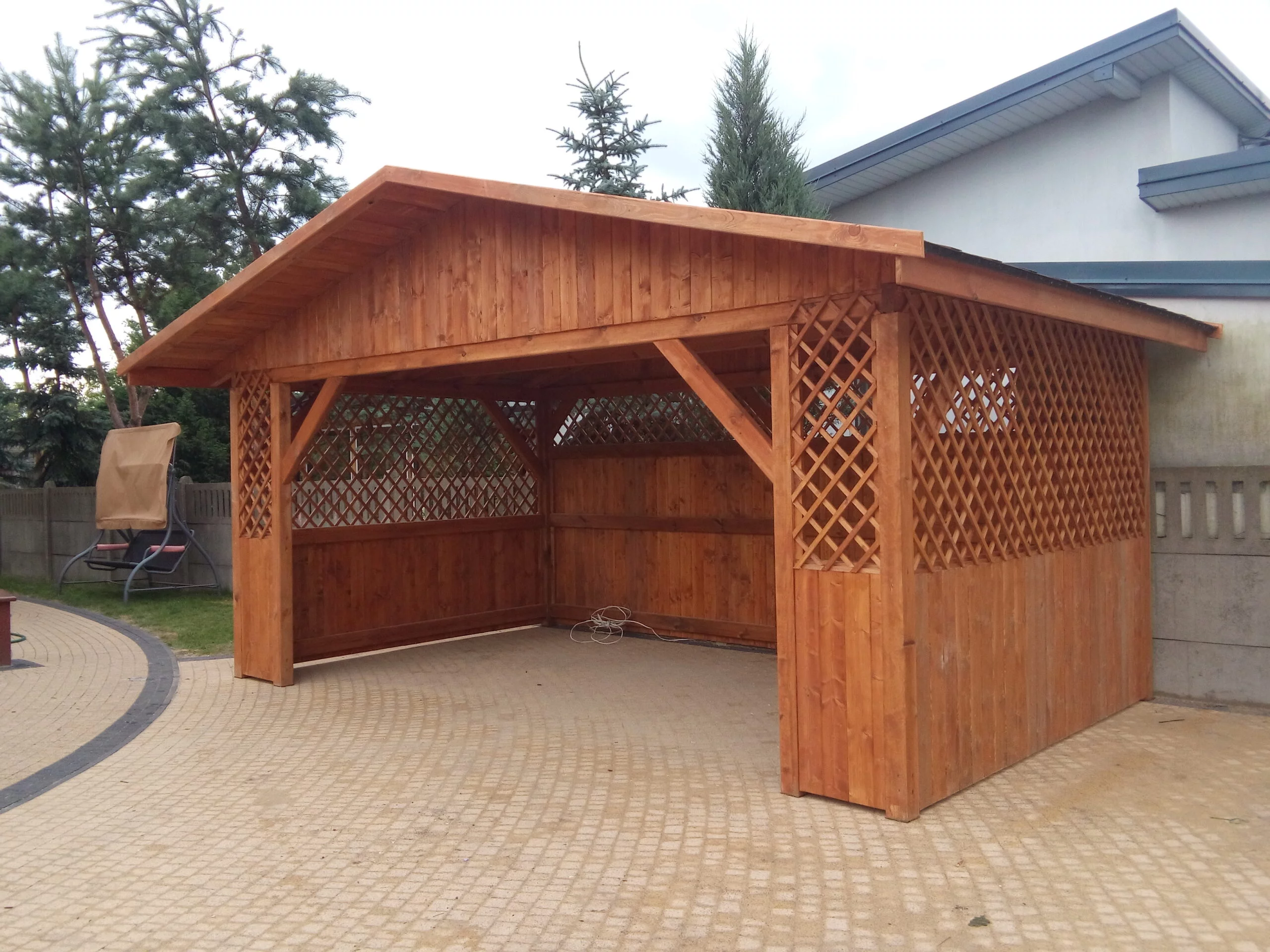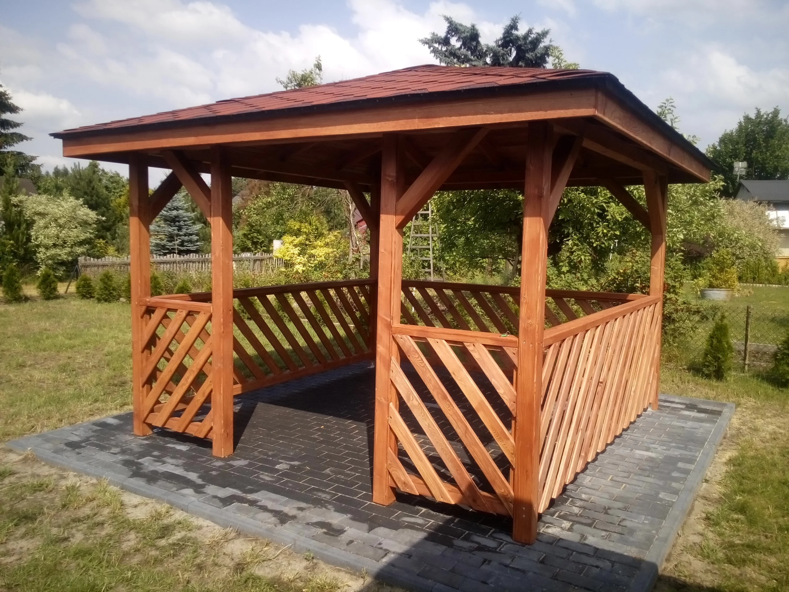 W zależności od wyboru, wykonujemy deskowanie ażurowe, krzyżaki, a u góry możemy dodać kratkę skośną lub prostą, dodając unikalny charakter altanie.
